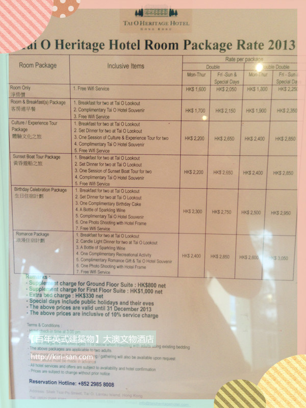 附錄1。大澳文物酒店房間價格参考。
