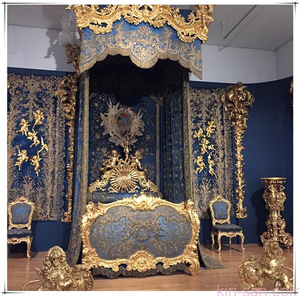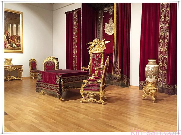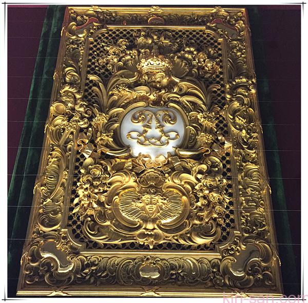 皇帝房間最觸目的導遊會說是天鵝型的水龍頭,可是還有我認為更有意思的,就是皇帝睡床上橫七豎八、如天主教教堂一樣的橡木製精緻尖塔直指天花。