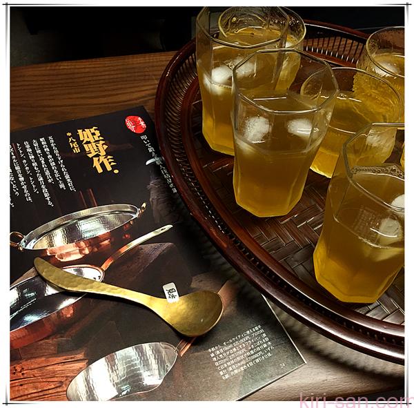 姫野先生為大家送上冰茶。桌子上有一只茶匙貼著「見本」的貼紙供。