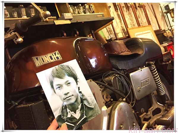 主人是個中年大叔,眉宇間看得出年青時外表不錯,他向我介紹自己55歲,這是30年前的他。後面的好像是他的愛騎?留意名字,正正是咖啡店的名字。
